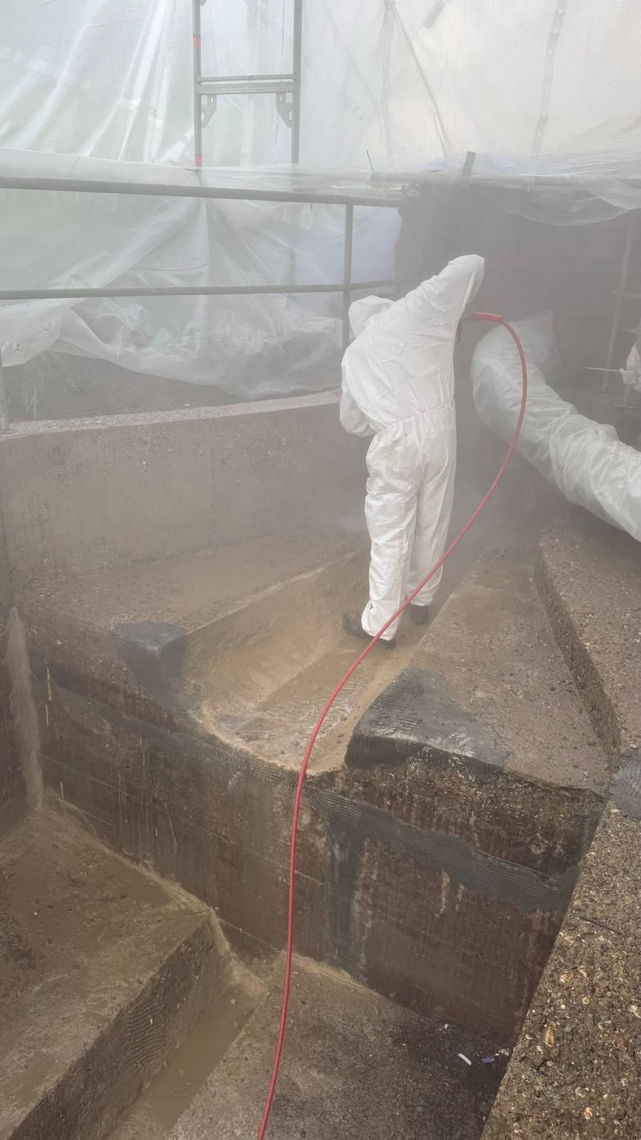 Kläranlage / Beton Untergrund | Ein Bauwerk / ca. 155 m2 | Reprofilierungsarbeiten: ERGELIT-SBM Infiltrationen: Hermes-WS Beschichtungssystem: ERGELIT-KBF40 | Nassspritzverfahren | G&H Kunststofftechnik |